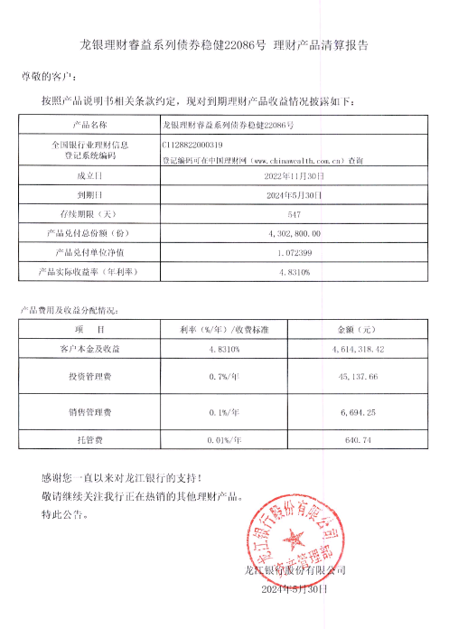龙银理财睿益系列债券稳健22086号理财产品清算报告