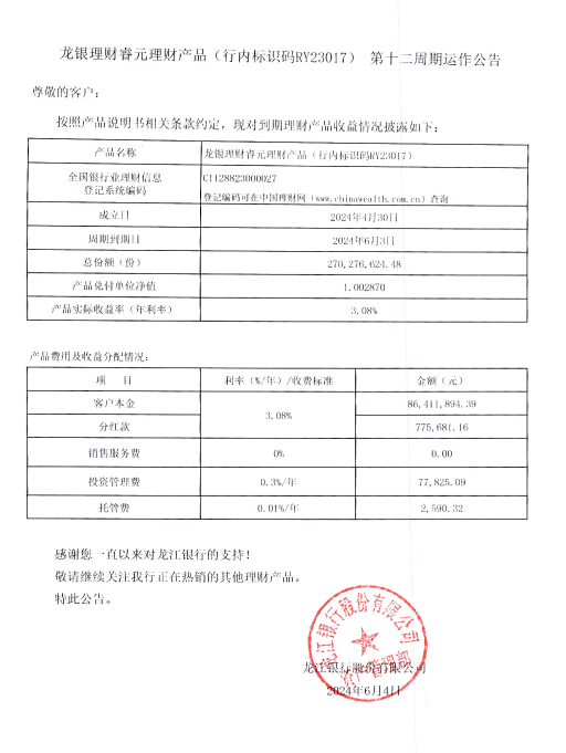 龙银理财睿元理财产品(行内标识码RY23017)第十二周期运作公告