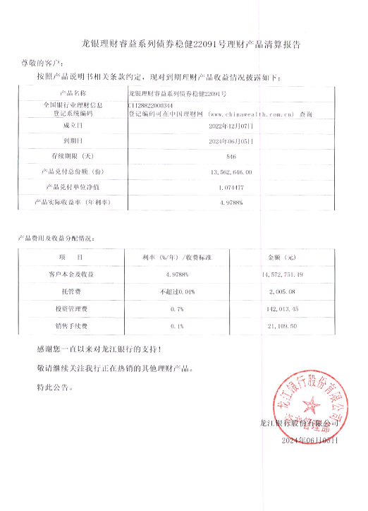 龙银理财睿益系列债券稳健22091号理财产品清算报告
