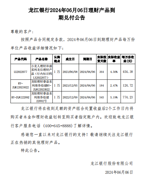 龙江银行2024年06月06日理财产品到期兑付公告