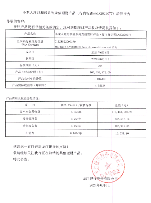小龙人理财和盛系列龙信理财产品(行内标识码LX2022077)清算报告