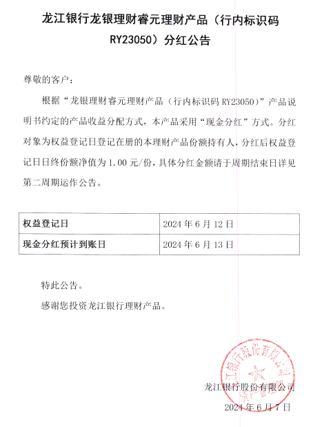 龙江银行龙银理财睿元理财产品(行内标识码RY23050)分红公告