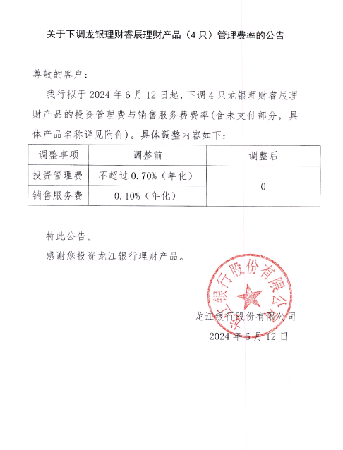 关于下调龙银理财睿辰理财产品(4只)管理费率的公告