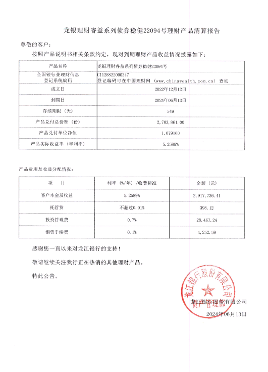 龙银理财睿益系列债券稳健22094号理财产品清算报告
