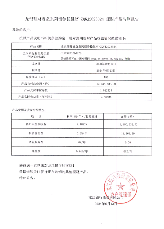 龙银理财睿益系列债券稳健RY-ZQWJ2023024理财产品清算报告