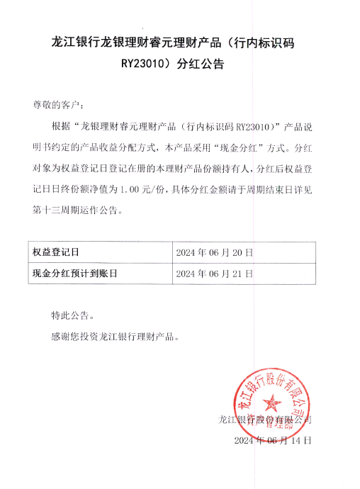 龙江银行龙银理财睿元理财产品(行内标识码RY23010)分红公告