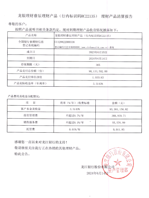 龙银理财睿辰理财产品(行内标识码RC22135)理财产品清算报告