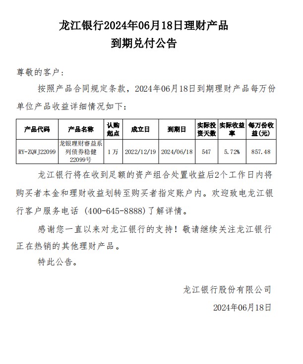 龙江银行2024年06月18日理财产品到期兑付公告