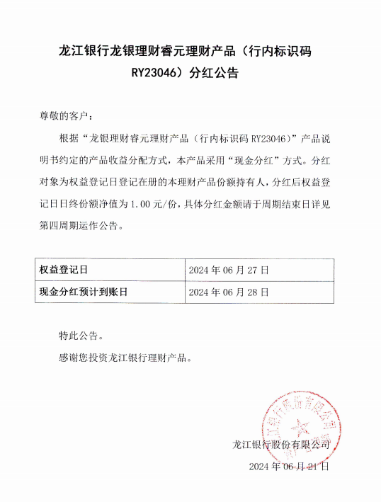 龙江银行龙银理财睿元理财产品(行内标识码RY23046)分红公告