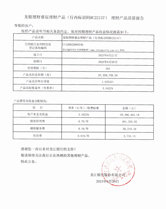 龙银理财睿辰理财产品(行内标识码RC22137)理财产品清算报告