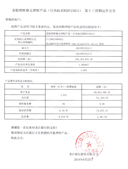 龙银理财睿元理财产品(行内标识码RY23012)第十三周期运作公告