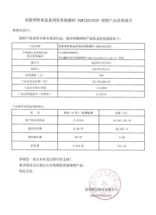 龙银理财睿益系列债券稳健RY-ZQWJ2023026理财产品清算报告