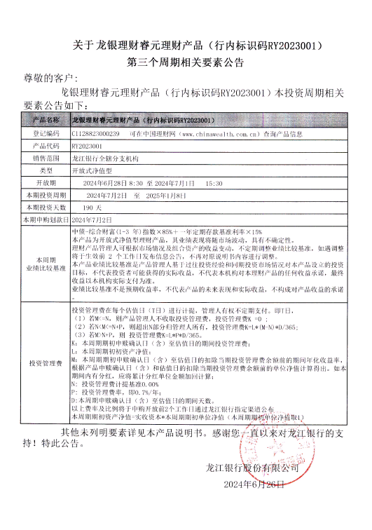 关于龙银理财睿元理财产品(行内标识码RY2023001)第三个周期相关要素公告