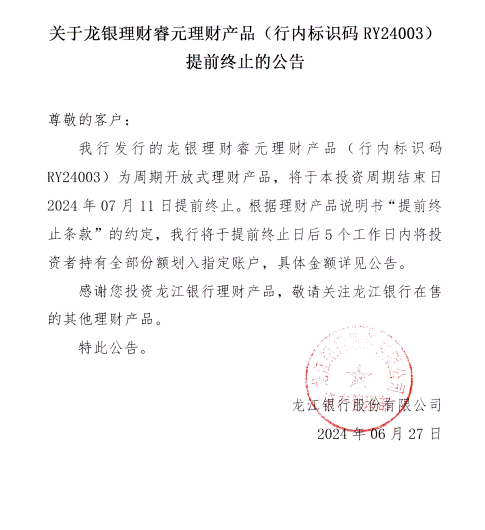 龙银理财睿元理财产品(行内标识码RY24003)提前终止的公告