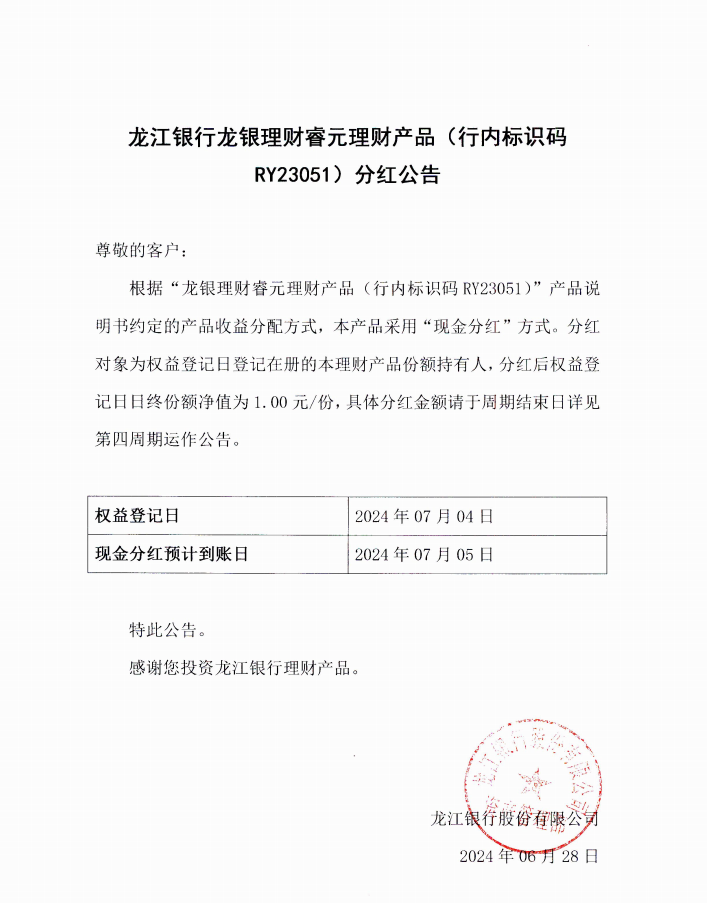 龙江银行龙银理财睿元理财产品(行内标识码RY23051)分红公告
