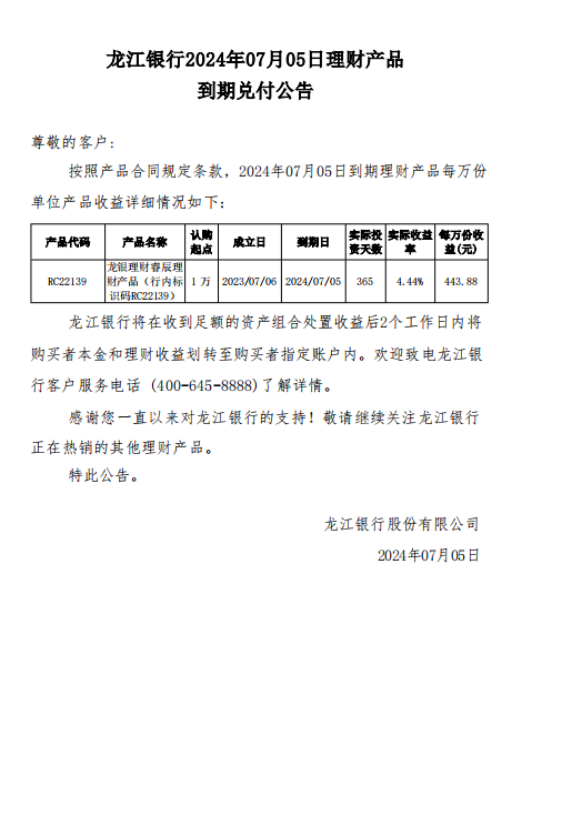 龙江银行2024年07月05日理财产品到期兑付公告