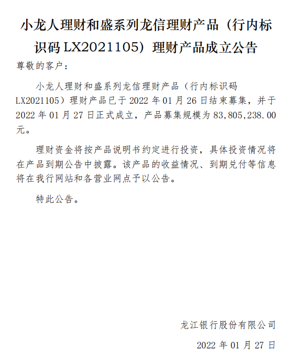 龙江银行(LX2021105)2022年01月27日理财产品成立公告