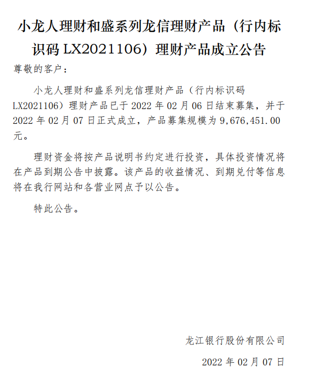 龙江银行(LX2021106)2022年02月07日理财产品成立公告