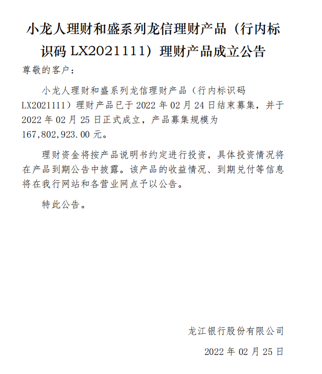 龙江银行(LX2021111)2022年02月25日理财产品成立公告