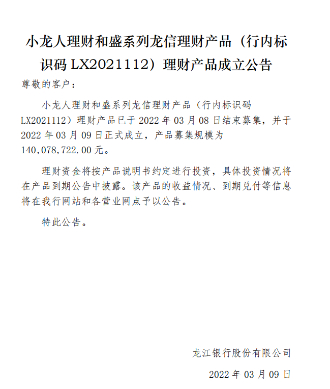龙江银行(LX2021112)2022年03月09日理财产品成立公告