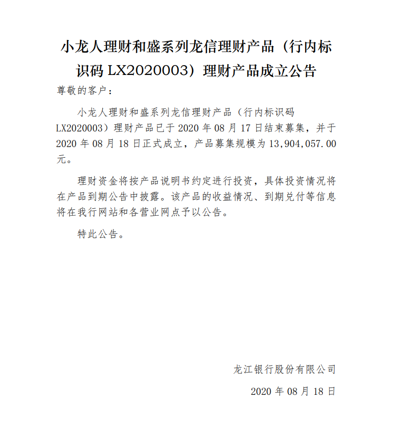 龙江银行(LX2020003)2020年08月18日理财产品成立公告