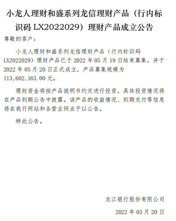 龙江银行(LX2022029)2022年05月20日理财产品成立公告