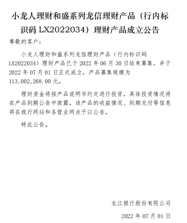 龙江银行(LX2022034)2022年07月01日理财产品成立公告