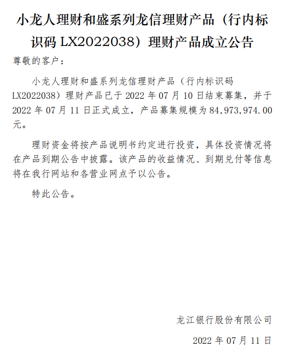 龙江银行(LX2022038)2022年07月11日理财产品成立公告