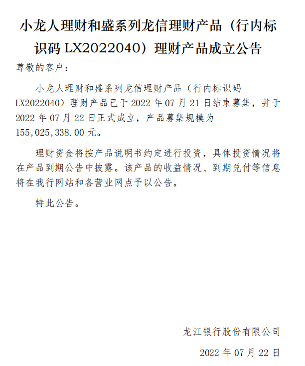 龙江银行(LX2022040)2022年07月22日理财产品成立公告