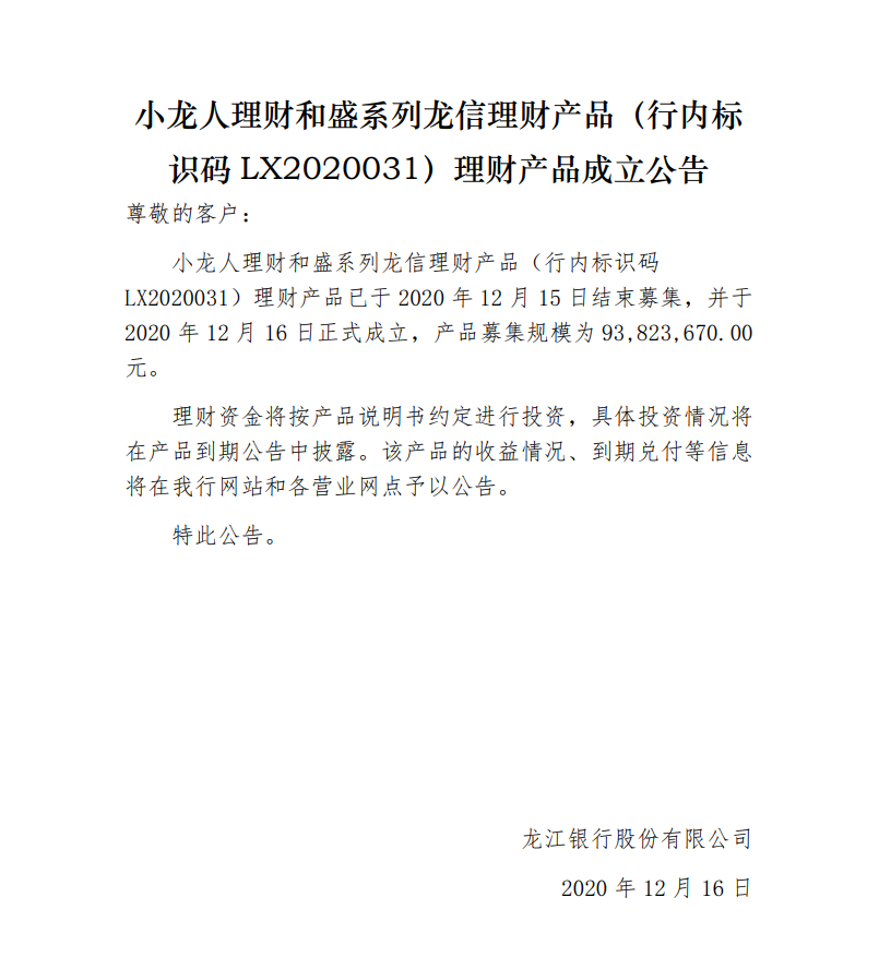 龙江银行(LX2020031)2020年12月16日理财产品成立公告