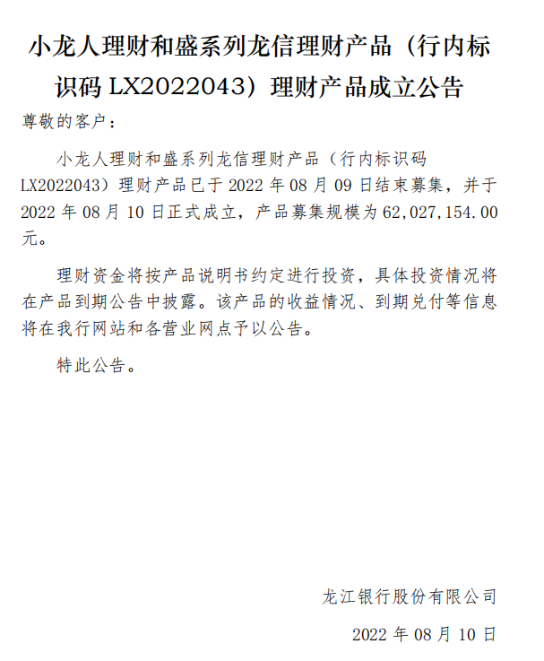 龙江银行(LX2022043)2022年08月10日理财产品成立公告