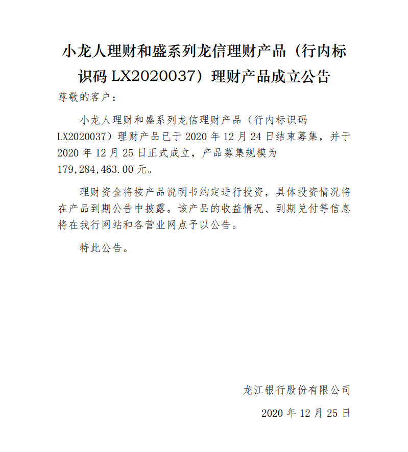 龙江银行(LX2020037)2020年12月25日理财产品成立公告