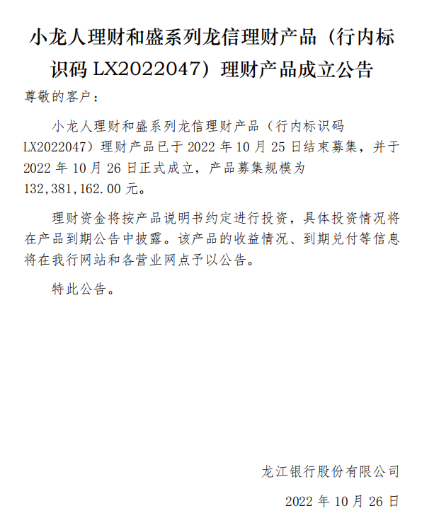龙江银行(LX2022047)2022年10月26日理财产品成立公告