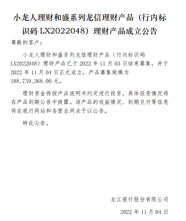 龙江银行(LX2022048)2022年11月04日理财产品成立公告
