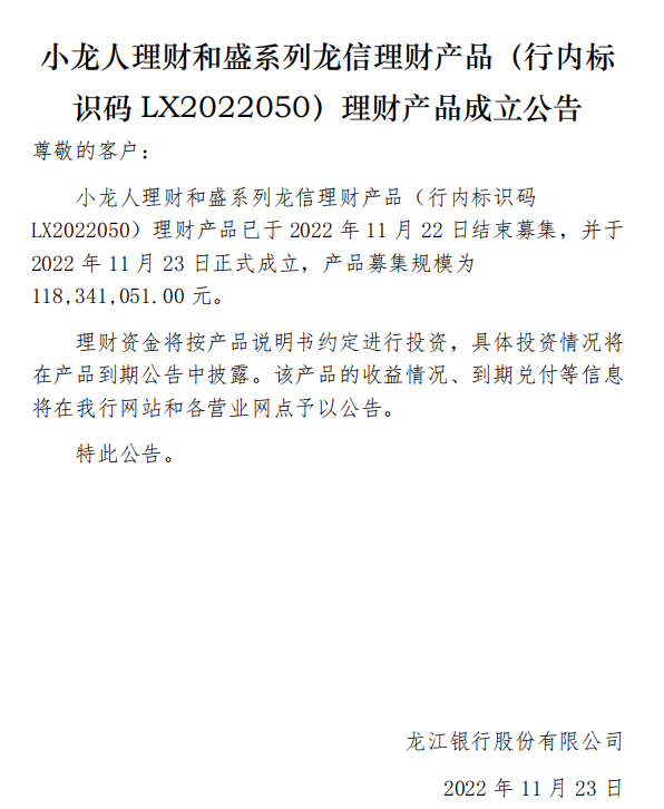 龙江银行(LX2022050)2022年11月23日理财产品成立公告
