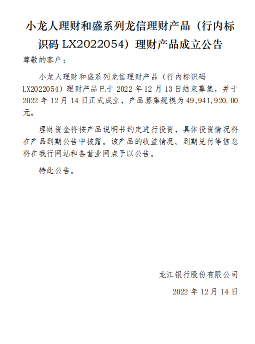 龙江银行(LX2022054)2022年12月14日理财产品成立公告