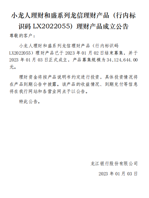 龙江银行(LX2022055)2023年01月03日理财产品成立公告