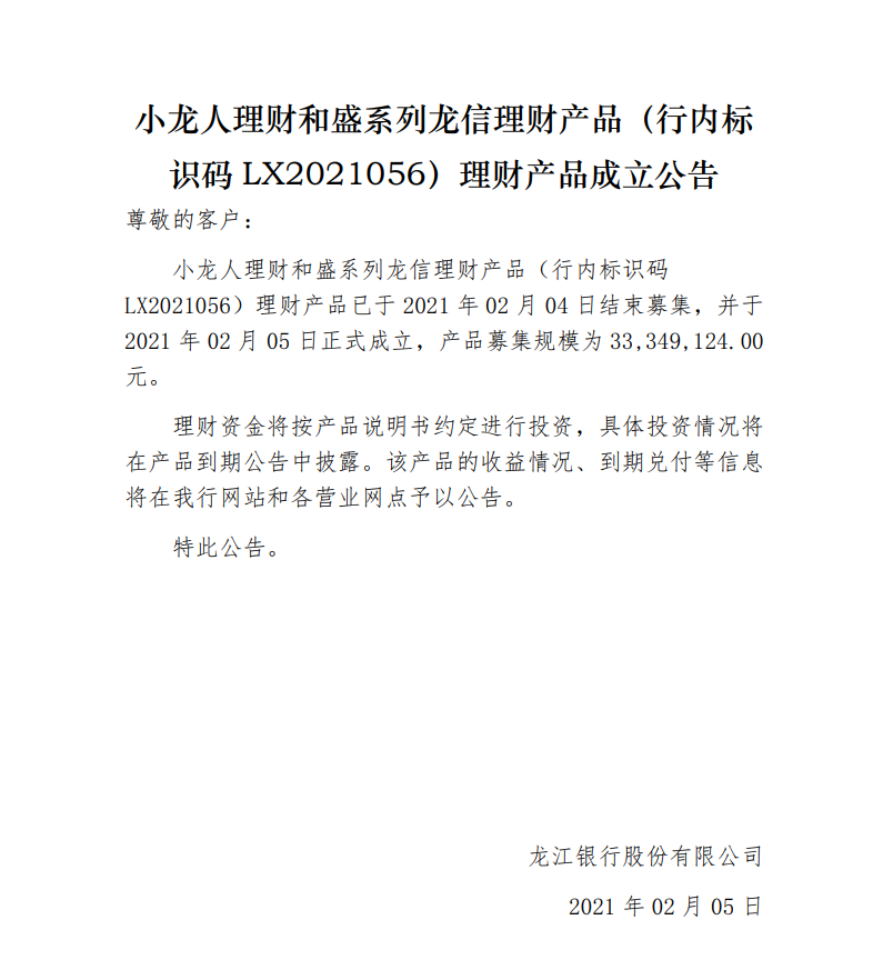 龙江银行(LX2021056)2021年02月05日理财产品成立公告
