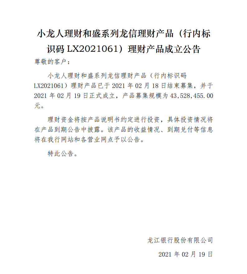 龙江银行(LX2021061)2021年02月19日理财产品成立公告