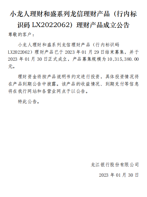 龙江银行(LX2022062)2023年01月30日理财产品成立公告