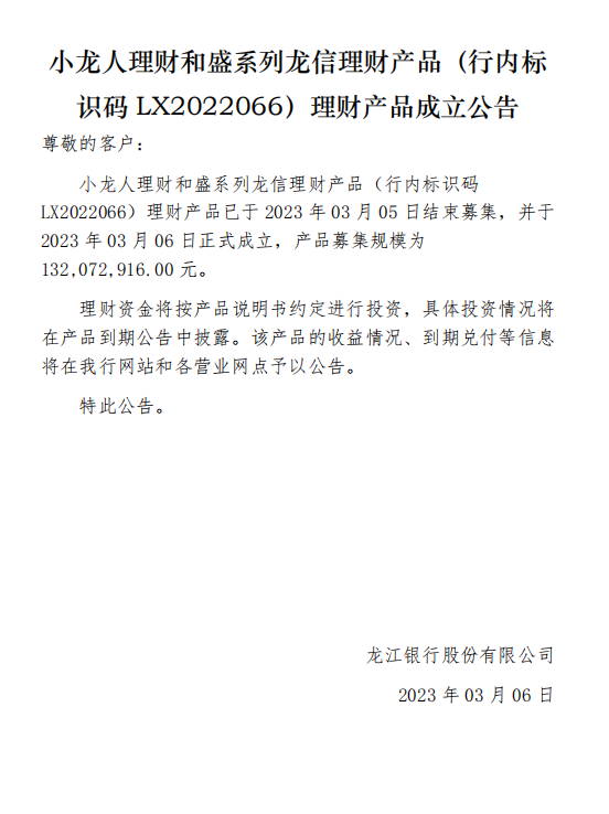 龙江银行(LX2022066)2023年03月06日理财产品成立公告