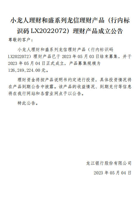 龙江银行(LX2022072)2023年05月04日理财产品成立公告