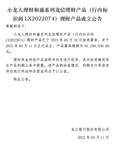 龙江银行(LX2022074)2023年05月11日理财产品成立公告