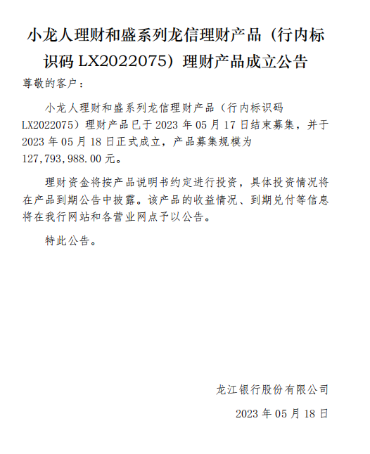 龙江银行(LX2022075)2023年05月18日理财产品成立公告