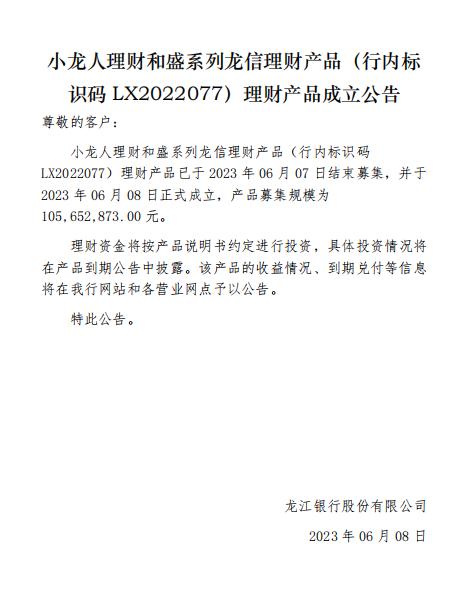 龙江银行(LX2022077)2023年06月08日理财产品成立公告