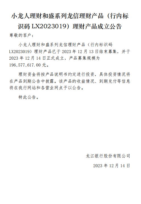 龙江银行(LX2023019)2023年12月14日理财产品成立公告