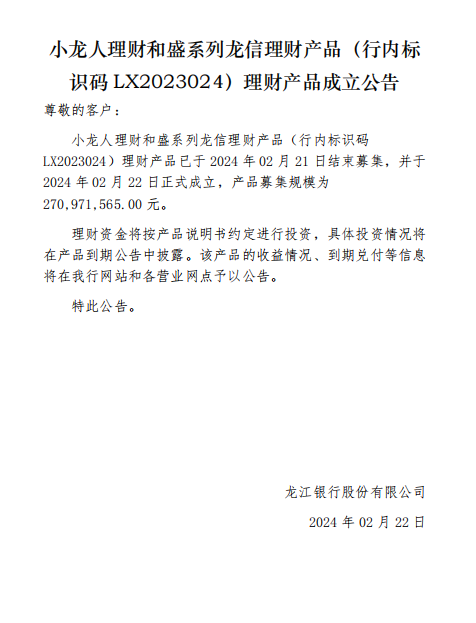 龙江银行(LX2023024)2024年02月22日理财产品成立公告