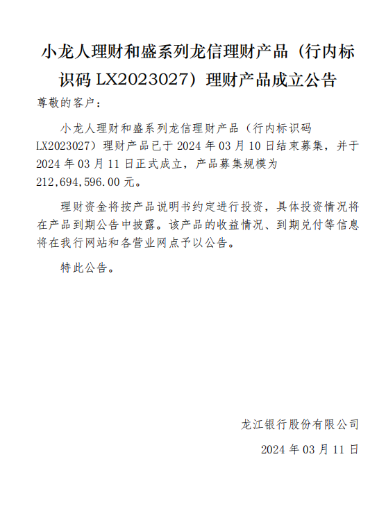 龙江银行(LX2023027)2024年03月11日理财产品成立公告