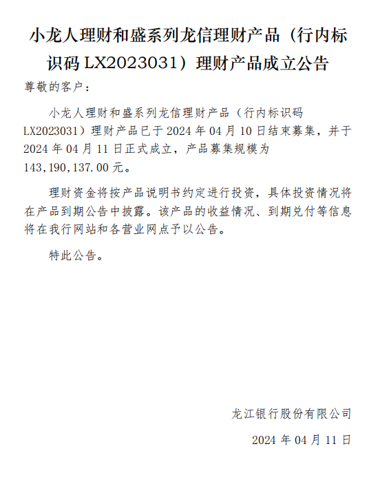 龙江银行(LX2023031)2024年04月11日理财产品成立公告