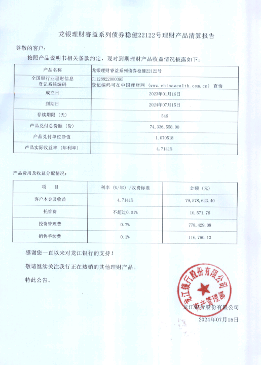 龙银理财睿益系列债券稳健22122号理财产品清算报告